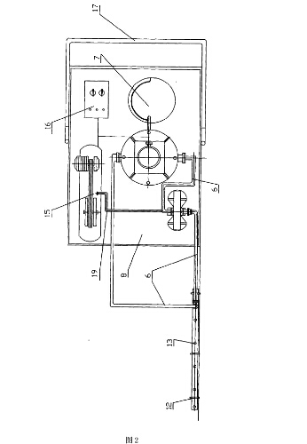 其1防爆储罐,2喷射横管,3喷射竖管,4气动隔膜泵,5自动清洗过滤器,6软胶管,7清污容器,8手推车,9吸油管,10清污隧道,11吸油口,12卡箍,13喷油口,14快速接头,15空气压缩机,16电器控制柜,17手推柄,18筋,19高压气管。