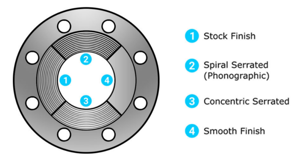 ASME B16.5 和 B16.47 法兰的 4 种基本表面处理是库存表面处理、螺旋锯齿表面处理、同心锯齿表面处理和光滑表面处理。