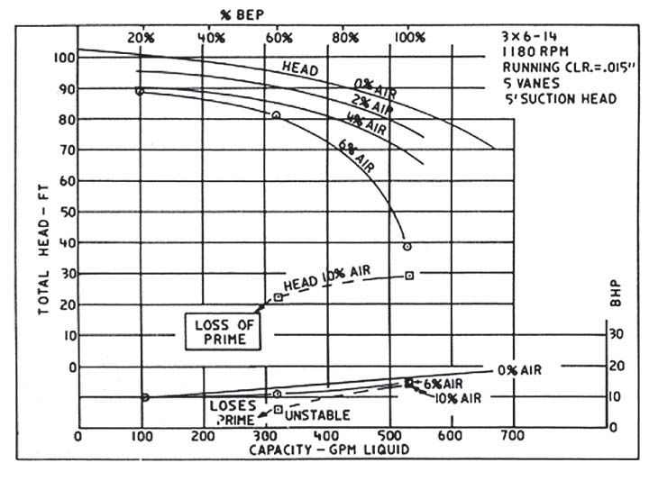 在气体含量为 2% 左右的所有情况下,都需要对泵性能进行校正??梢源?10% 以上的气体浓度,但需要设计具有特定气体处理特性的泵,例如涡流叶轮泵、侧通道泵和再生涡轮泵。