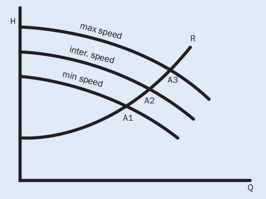 改变泵的速度会改变泵的性能曲线。这会改变与系统阻力曲线的交点,从而导致流量发生变化。如下图所示。