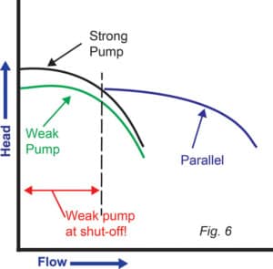如果一个泵表现出较低的关闭 TDH 特性,它将在关闭状态下运行,直到主导泵在其曲线上移动足够远,以至于其 TDH 低于具有较低扬程的泵的关闭 TDH(图 5 )。